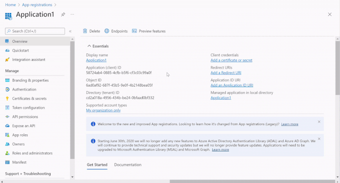 - Copy the Application (client) ID and the Directory (tenant) ID from your registered application’s page and paste them into their respective fields in the integration setup page.