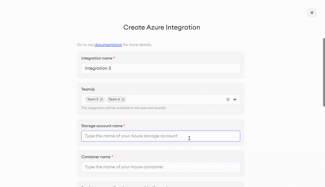 - Under Team, you can add the integration to one or multiple teams (optional). The integration will be available in the selected team(s) only.